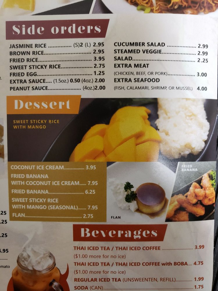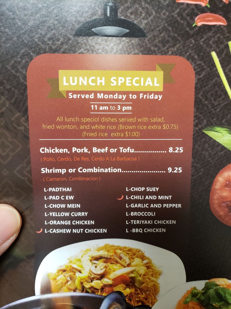 Thai small rice noodle stir fried with your choice of meat, egg, bean sprout, red onion, green onion and crushed peanuts.